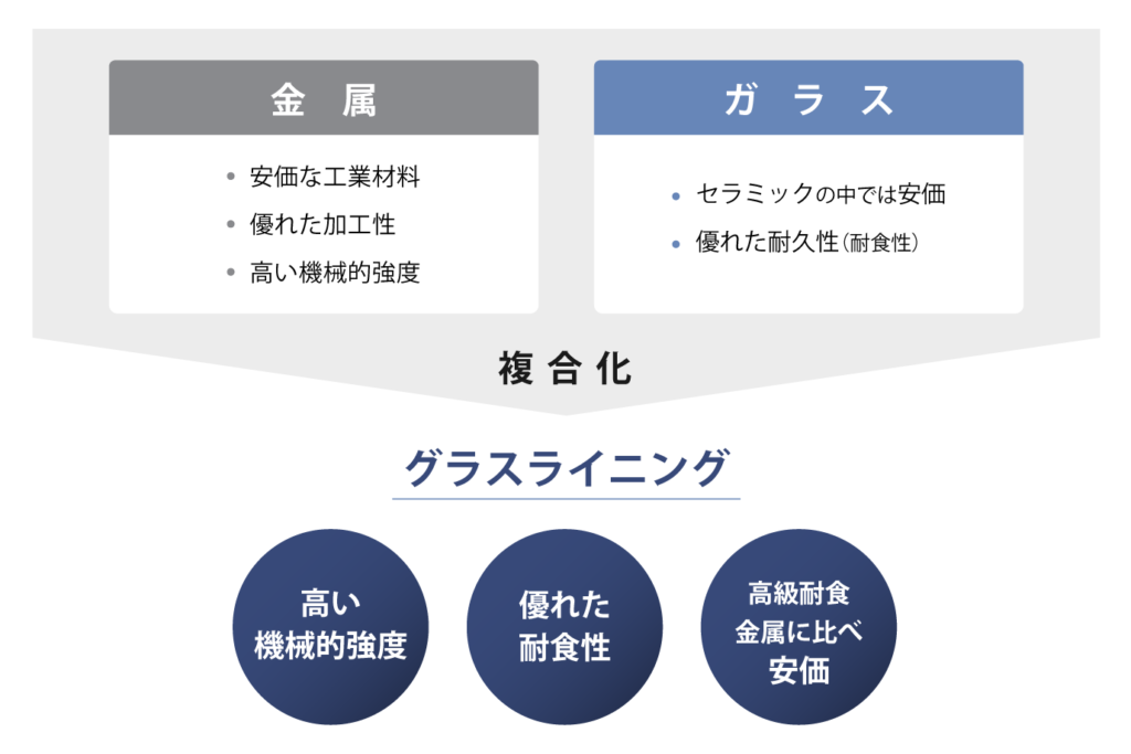 グラスライニングとは、腐食環境等から金属を保護するために金属の表面にガラスを焼き付ける複合材料です。